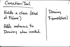 The DrawingController collaborates with Tools to make changes. I didn't make a card for abstract Tool since it didn't carry any responsibility I felt needed recording. The class naming conventions implies its existence.