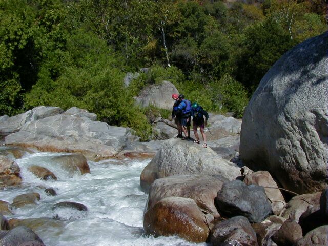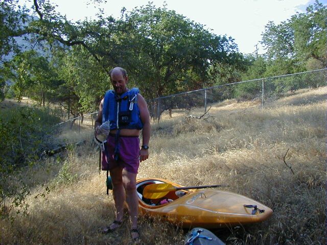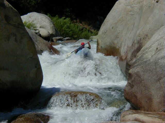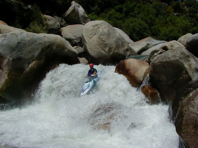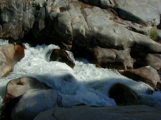 This run is longer than the one above, slightly less difficult and contains two very high gradient sections as well as a very long and difficult possible portage around the difficult waterfall and gorge below the Park Headquarters at Ash Mountain. Between the major major drops there is a surprising amount of the river that can be run by boat scouting or easy scouting from the bank. Everything is easily portable with the exception of the Gorge. High above on the right the road is never far away but the bank is steep and there is mega poison oak. This section is also sometimes refered to as The Hospital Rock Section by those who don't descriminate between the two sections. Very seldom is this run attempted in combination with the real Hospital Rock Section due to the high overhead and long day that results.