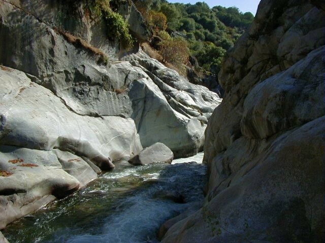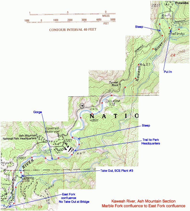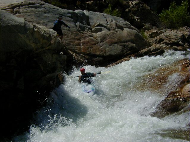 into a Shear Gorge followed in 25 yards by a 10 foot waterfall into the heart of the gorge. The best portage is to take out 300 yards upstream at the trail to Ash Mtn. Park Headquarters, hike to the road and portage down the highway 300 yards then take the easy swimmers trail back to the river at a turnout 50 yards downstream of the Southern Sequoia Research Center driveway. The Strenuous Portage up the cliffs just before the gorge is not recommended. Be careful in the section before the gorge. Boat too far and your only exit may be up the cliffs if you elect not to run the Class 5+ into the gorge. It is reported that you will go deep in the Falls. The river looses 30 feet in the entrance rapid and the falls in a 75yard stretch. Most of the drop is in the entrance rapid going into the gorge. Scout the waterfall into the gorge from the swimmers trail before your run if you are unfamiliar with the gorge. You can see the left half of the falls easily and the entrance rapid with a bit more work.